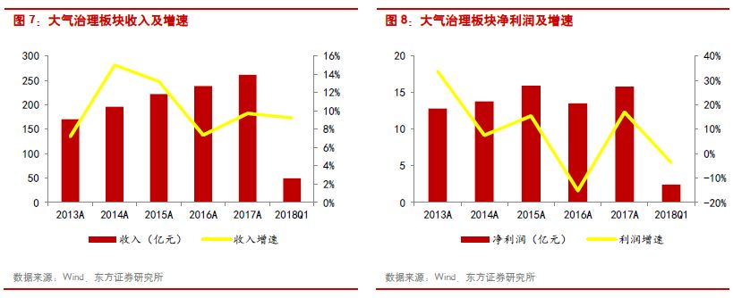 分各個細分板塊看,水環(huán)境治理、監(jiān)測、再生資源等實現了較高的業(yè)績增速,行業(yè)景氣度較高,而傳統(tǒng)的大氣治理、節(jié)能板塊增速較低。同時,公司的兩極分化也日益明顯,競爭力較強的板塊龍頭,尤其是所處行業(yè)景氣度較高的龍頭企業(yè),收入和利潤增速顯著高于行業(yè)平均水平。