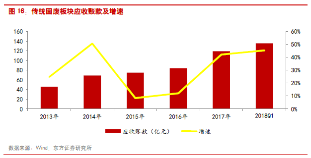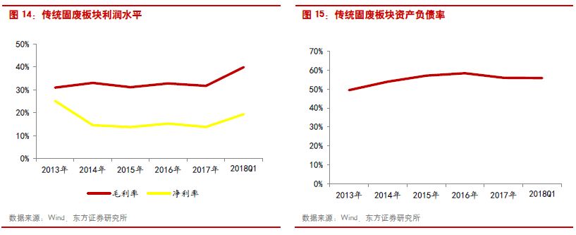傳統(tǒng)固廢:由于盛運環(huán)保2017年出現重大的業(yè)績變化(2016年歸母凈利潤為1.19億,2017年虧損13.18億),在統(tǒng)計傳統(tǒng)固廢處置板塊時剔除了盛運環(huán)保的影響。因此傳統(tǒng)固廢處置板塊2017年的收入和利潤增速分別為27.95%和15.53%。收入增速為最近三年最高,主要得益于環(huán)衛(wèi)、危廢等業(yè)務的收入占比的提升,而凈利潤增速低于營業(yè)收入的增速主要是因為環(huán)衛(wèi)業(yè)務增長的初期,項目的毛利率相對有限。從利潤水平看,傳統(tǒng)固廢的毛利率基本保持在30%左右,但由于運營、銷售和財務費用的增加,導致行業(yè)的凈利率水平呈現下滑趨勢,2017年凈利率為13.78%。行業(yè)資產負債率基本保持55%左右。應收賬款方面,由于每年仍有垃圾焚燒工程以BOT模式進入開工建設期,所以行業(yè)的應收賬款增速上升,2017年增速達到42.13%。