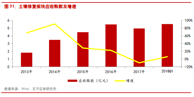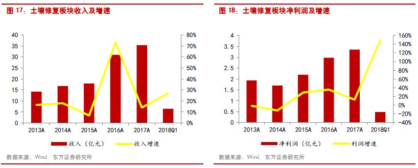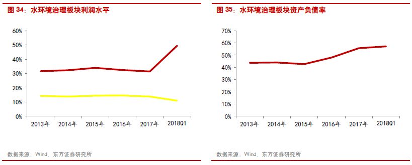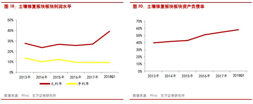 土壤修復:由于全國土壤污染普查尚未結束,且“十三五”前中期的環(huán)保治理重點在煙氣治理和水環(huán)境綜合治理,因此2017年土壤修復行業(yè)新增訂單較少,土壤修復板塊2017年的收入和利潤增速分別為13.98%和12.57%,明顯低于2016年同期水平。由于拓展了PPP的業(yè)務,行業(yè)資產負債率呈現上升趨勢,2017年資產負債率為57.94%,比上一年同期增加了近3個百分點。