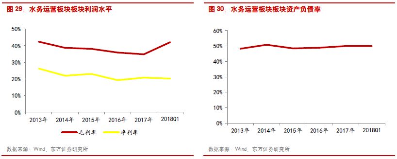 傳統(tǒng)水務運營:傳統(tǒng)水務2017年和2018Q1實現收入增速分別為15.19%和20.89%,歸母凈利潤同比增長23.92%和-13.14%。由于受到增值稅政策調整的影響,傳統(tǒng)水務板塊2016年業(yè)績?yōu)樨撛鲩L,但2017年以后增值稅對于行業(yè)的影響基本消除,行業(yè)回到20%左右的利潤增速水平。個股方面,重慶水務由于污水處理業(yè)務增值稅及附加稅費、污水處理業(yè)務增值稅即征即退、收到實際承擔污水增值稅及附加稅費的補助等事項影響,歸母凈利潤同比增長93.51%至20.67億元。