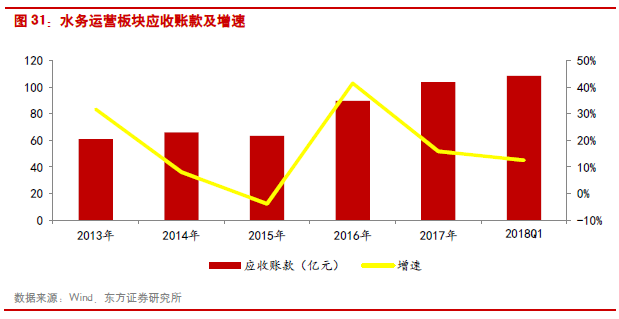 大氣治理板塊2017年收入和歸母凈利潤分別同比增長9.73%和16.95%;2018年Q1收入增速9.24%,凈利潤增速-3.65%。行業(yè)整體的利潤體量較2016年有所好轉主要是由于科融環(huán)境和龍源技術業(yè)績扭虧為盈所致(科融環(huán)境和龍源技術2016年凈利潤分別為-1.32和1.64億元),但合計利潤體量占到大氣治理板塊近9成的龍凈環(huán)保和清新環(huán)境的利潤增速卻相對有限,低于其他板塊的龍頭公司,其中龍凈環(huán)保的利潤增速為9.10%,而清新環(huán)境則同比下滑12.44%。大氣治理板塊由于費用率增加,凈利率已降至5.33%。行業(yè)資產負債率也基本保持在57%左右。應收賬款方面,由于大部分大氣治理項目開始進入運營階段,所以行業(yè)整體應收賬款增速開始放緩,2017年增速約為11%。