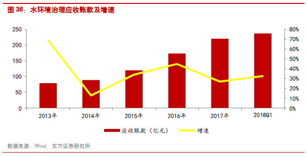 水環(huán)境治理:水環(huán)境治理是環(huán)保中涉及PPP影響最大的細分領域,2017年在PPP項目管理庫持續(xù)擴容的大背景下,水環(huán)境治理相關的上市公司實現了訂單大幅增長,并有效地轉化成了公司的收入。同時2017年下半年以來財政部限制地方債務和規(guī)范PPP的相關政策法規(guī)對環(huán)保類PPP項目的影響相對有限,因此2018Q1延續(xù)了行業(yè)的高景氣度。水環(huán)境治理板塊2017年收入增速48.03%,歸母凈利潤增速40.54%;2018年Q1收入增速61.92%,歸母凈利潤增速0.13%。板塊的利潤水平基本保持穩(wěn)定,毛利率30%左右,受財務費用增長影響,凈利率降至13.84%。由于水環(huán)境治理類PPP項目對企業(yè)的資金能力要求較高,行業(yè)融資需求加大,2017年板塊的資產負債率由上一年的48.06%增長到55.69%。2017年應收賬款增速為26.99%,略高于其他環(huán)保板塊。