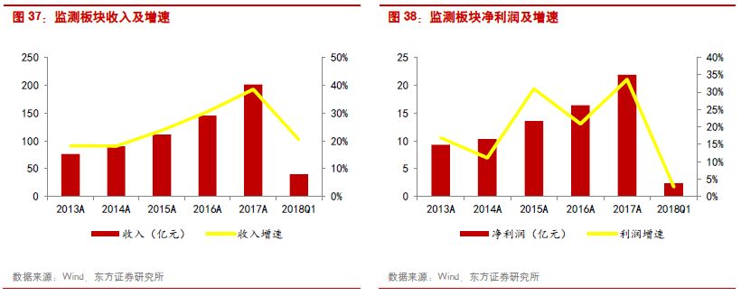 監(jiān)測板塊個股中不乏高成長企業(yè)。2017年,先河環(huán)保由于網格化監(jiān)測訂單增長實現了78.68%的業(yè)績增長,天瑞儀器、理工環(huán)科受并表因素影響,利潤增速均超過了80%。