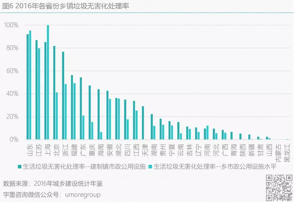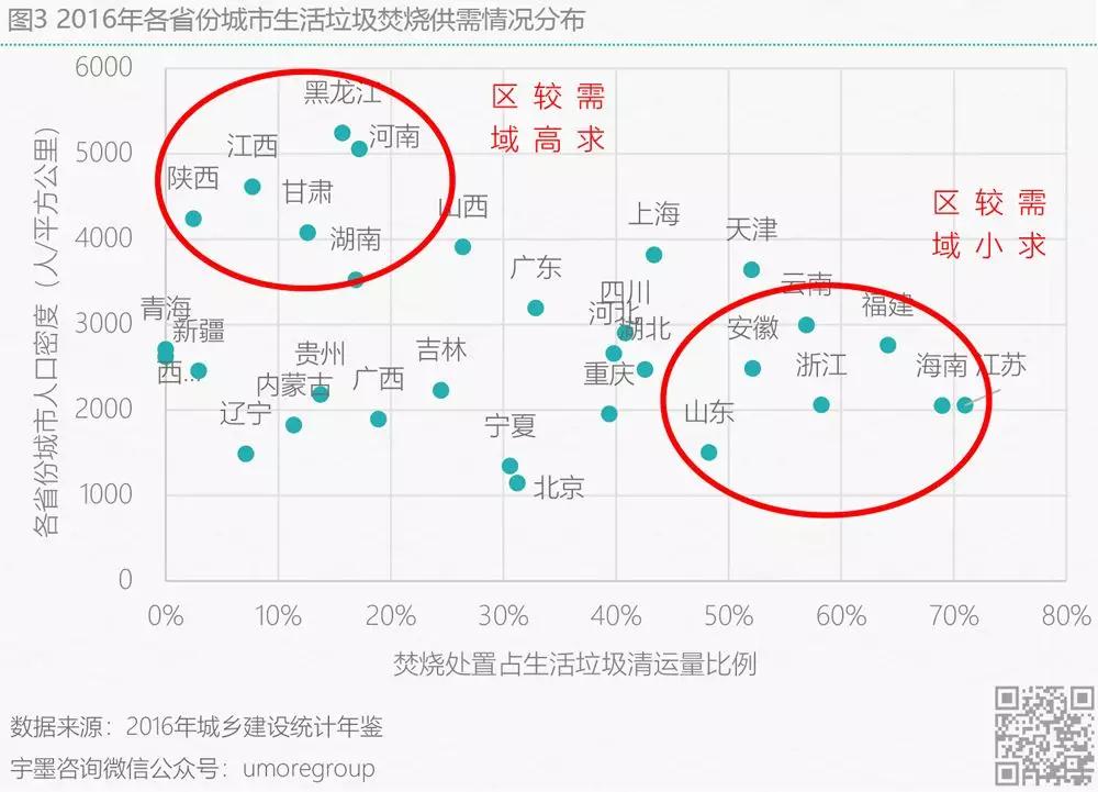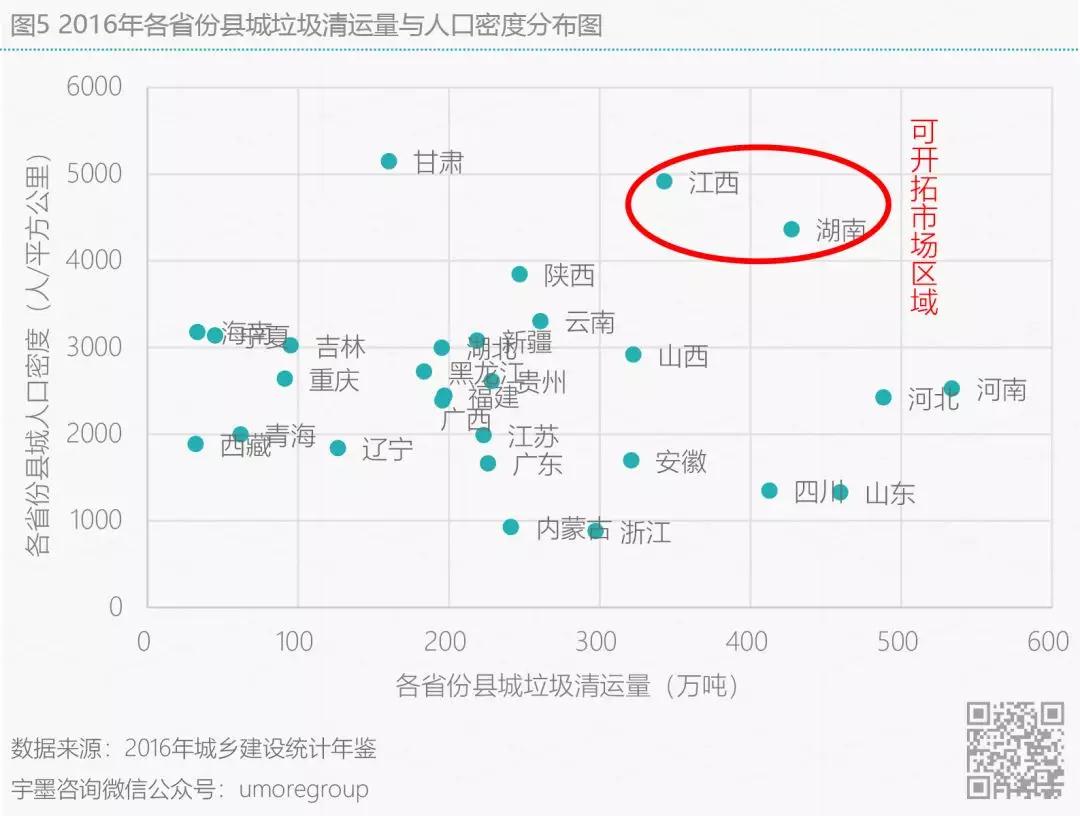 接下來從各省份縣域維度分析,從城建部的數(shù)據(jù)來看全國各個省份的生活垃圾無害化處置率基本都維持在70%以上,但是除了上海、江蘇、浙江、安徽、山東、寧夏這六個省市區(qū)外,其余地區(qū)焚燒處置垃圾比率均不足10%(圖4),而甘肅、江西、湖南三個省份縣城人口密度最高,焚燒比率缺口相對較大。另一方面,一個地區(qū)的垃圾清運量理應與地區(qū)的人口密度成正比,但是由于中國縣級以下地區(qū)人口遷移度大,戶籍人口密度與常住人口密度出入存在一定差異,因此從圖6可看在甘肅地區(qū)垃圾清運較低但人口密度偏高的地區(qū),人口外流比例會相對較高,當然這里也不排除各地市人均垃圾產生量有較大差異。宇墨通過對各省份縣城垃圾清運量與各省份縣城人口密度分布的分析(圖5),推斷在人口密度相對高且垃圾產生量相對較多的江西和湖南兩省份的縣城區(qū)域開辟垃圾焚燒發(fā)電市場相對較容易,而在這些省份縣城中那些旅游景區(qū)及高校等區(qū)域或有更多的垃圾供給。畢竟對于縣級鄉(xiāng)級地市建設垃圾焚燒發(fā)電廠有一大難題,當焚燒廠建好后,由于垃圾產生量不足而造成的垃圾發(fā)電廠無法長期運營的情況對企業(yè)來說乃是硬傷,且在《“十三五”全國城鎮(zhèn)生活垃圾無害化處理設施建設規(guī)劃》中已提出不鼓勵建設處理規(guī)模小于300噸/日的焚燒設施。對于想要進軍縣級區(qū)域開辟市場的企業(yè)來說,如何有效收集垃圾以及降低收運成本使得焚燒廠實現(xiàn)滿負荷工作將是主要考慮因素。