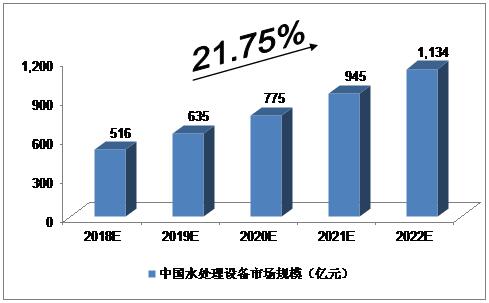 我們預計,2018年我國水處理設(shè)備市場規(guī)模將達到516億元,未來五年(2018-2022)年均復合增長率約為21.75%,2022年將達到1,134億元。