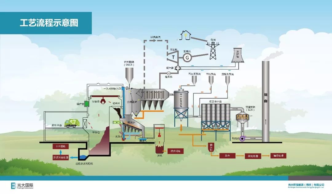 垃圾在焚燒過程中產(chǎn)生的煙氣,采用“SNCR爐內(nèi)脫硝+半干式反應(yīng)塔脫酸+干法脫酸+活性炭吸附+布袋除塵+煙氣再循環(huán)”煙氣凈化處理工藝。卸料大廳、垃圾倉和滲濾液收集池等散發(fā)的惡臭氣體,在惡臭污染工位,采用負壓引風(fēng)進入焚燒爐焚燒。垃圾坑滲濾液、地面沖洗水等進入滲濾液處理站處理,采用“預(yù)處理+厭氧反應(yīng)器+生化處理系統(tǒng)(A/O)+超濾(UF)+化學(xué)軟化(TUF)+反滲透(RO)”,處理后滿足《城市污水再生利用工業(yè)用水水質(zhì)》(GB/T19923-2005)。垃圾焚燒過程產(chǎn)生的爐渣為一般固體廢棄物,全部用于制磚或作為路基材料進行綜合利用。垃圾焚燒過程產(chǎn)生的飛灰在廠內(nèi)穩(wěn)定固化后外運安全填埋。