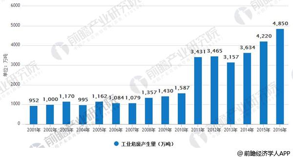 2001-2016年中國工業(yè)危廢產(chǎn)生量情況