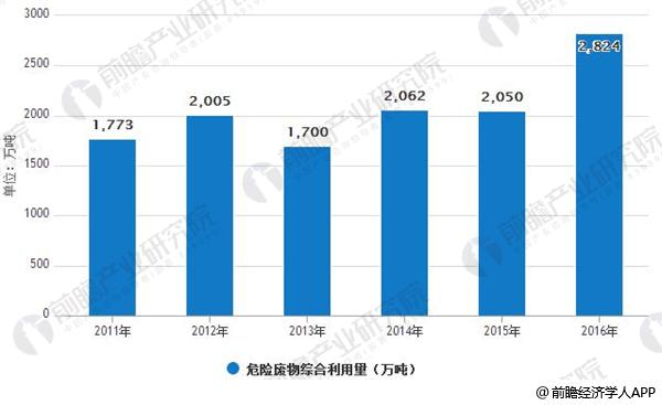 2016年危廢綜合利用量為2824萬噸,同比增長38%