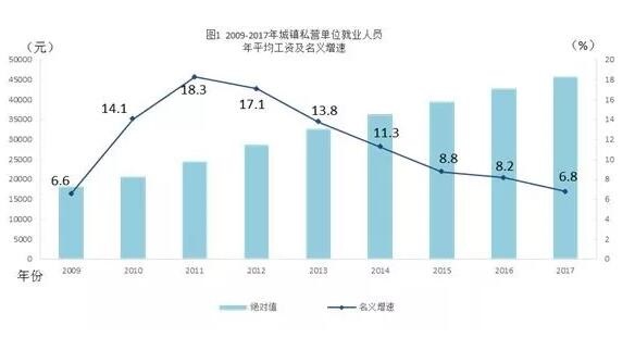 2018年5月15日,國家統(tǒng)計局發(fā)布了2017年平均工資主要數(shù)據(jù)。2017年全國城鎮(zhèn)私營單位就業(yè)人員年平均工資為45761元,與2016年的42833元相比,增加了2928元,同比名義增長6.8%,增速比2016年回落1.4個百分點??鄢飪r因素,2017年全國城鎮(zhèn)私營單位就業(yè)人員年平均工資實際增長5.0%。