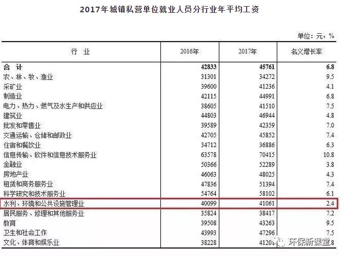 環(huán)保行業(yè)平均工資水平位于全行業(yè)排名倒數(shù)第五位,排在“居民服務(wù)、修理及其他服務(wù)行業(yè)”的前面,并且工資增速為全行業(yè)倒數(shù)第一!