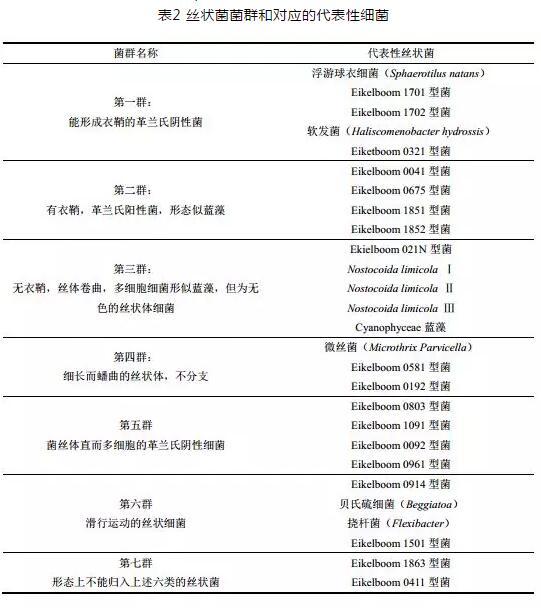 污泥膨脹和生物泡沫的產(chǎn)生主要與活性污泥中微生物的種類以及生長情況有關(guān)。有大量研究表明,當(dāng)進(jìn)水含硫化物或營養(yǎng)物質(zhì)缺乏時,會引起硫絲菌和貝氏硫絲菌的過度繁殖,而含溶解性碳水化合物高的廢水會引起浮游球衣細(xì)菌的過度增殖,這些都會引發(fā)污泥膨脹?;钚晕勰嘀蟹种岱啪€菌(Mycolata)過度繁殖也會造成污泥膨脹和生物泡沫,因為分枝菌酸放線菌的細(xì)胞壁中含有長鏈枝狀的分枝菌酸,造成細(xì)胞表面呈疏水性,而細(xì)胞疏水性正是形成絲狀菌污泥膨脹和生物泡沫的必要條件。另外也有報道認(rèn)為,微絲菌(Microthrix parvicella)的大量增殖也會引起污泥膨脹和生物泡沫,因為微絲菌在生長繁殖過程中可利用長鏈脂肪酸作為碳源和能源,多余的長鏈脂肪酸被富集、儲存在體內(nèi),這由油脂組成大液珠可以達(dá)到細(xì)胞干重的35%,使得活性污泥比重進(jìn)一步降低,更易漂浮到水面形成浮沫。絲狀菌并不是一種特殊的微生物,而是具有絲狀或枝狀特性的微生物的統(tǒng)稱。從本質(zhì)上來說,絲狀菌是具有疏水表面層的,與油類的特性相似。它可以附著疏水性底物上,并通過食用它們作為食物來源而生長。Eikelboom通過對數(shù)百個污水處理廠的數(shù)千個污泥樣品進(jìn)行了觀察和研究,將所觀察的絲狀菌區(qū)分為26大類,分類依據(jù)包括:(1)是否存在衣鞘和粘液;(2)是否滑行運動;(3)真分支或假分支;(4)革蘭氏染色和奈氏染色反應(yīng)的特征;(5)絲狀體的長短、性質(zhì)和形狀;(6)細(xì)胞直徑、長短和形狀;(7)有無胞含體(PHB,多聚磷酸鹽和硫粒等)等。根據(jù)以上七個方面的特性分為7個群,如表2所示。