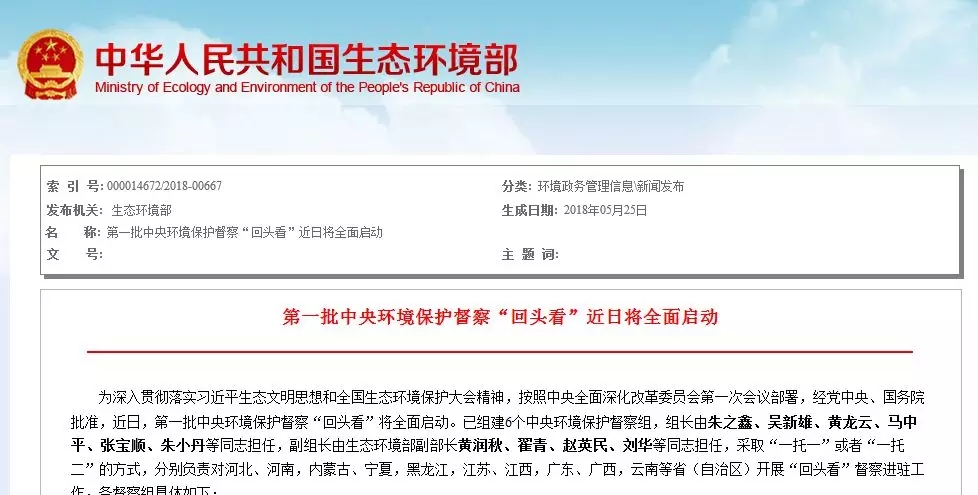為深入貫徹落實習(xí)近平生態(tài)文明思想和全國生態(tài)環(huán)境保護大會精神,按照中央全面深化改革委員會第一次會議部署,經(jīng)黨中央、國務(wù)院批準(zhǔn),近日,第一批中央環(huán)境保護督察“回頭看”將全面啟動。
