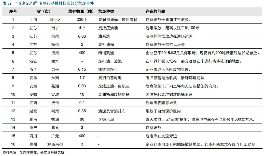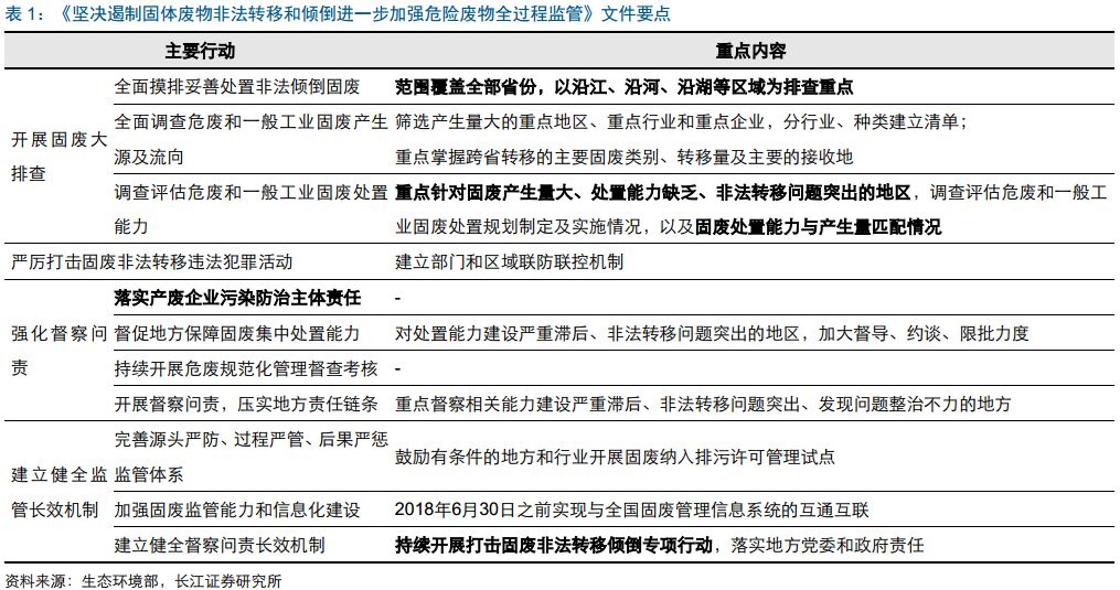 5月22日生態(tài)環(huán)境部印發(fā)《關(guān)于堅(jiān)決遏制固體廢物非法轉(zhuǎn)移和傾倒進(jìn)一步加強(qiáng)危險(xiǎn)廢物全過程監(jiān)管的通知》,提出“提高政治站位,切實(shí)增強(qiáng)“四個(gè)意識”,深刻認(rèn)識遏制固體廢物非法轉(zhuǎn)移和傾倒,加強(qiáng)危險(xiǎn)廢物全過程監(jiān)管工作的重要性;要按照省級督導(dǎo)、市縣落實(shí)、嚴(yán)厲打擊、強(qiáng)化監(jiān)管的總體要求摸清固體廢物,特別是危險(xiǎn)廢物產(chǎn)生、貯存、轉(zhuǎn)移、利用、處置情況”。既要摸清家底,又要強(qiáng)調(diào)處置能力總量建設(shè)和處置種類匹配程度;強(qiáng)調(diào)產(chǎn)廢企業(yè)的污染防治主體責(zé)任和政府長效監(jiān)管責(zé)任。該文件是全國環(huán)保大會后發(fā)布的第二個(gè)指向明確的環(huán)境整治行動(dòng)(第一個(gè)是飲用水源地專項(xiàng)督查),排查范圍由“清廢2018”的長江沿線11個(gè)省擴(kuò)展至全國,行動(dòng)定位上升至“政治站位”高度,統(tǒng)一思想,危廢景氣度提升。