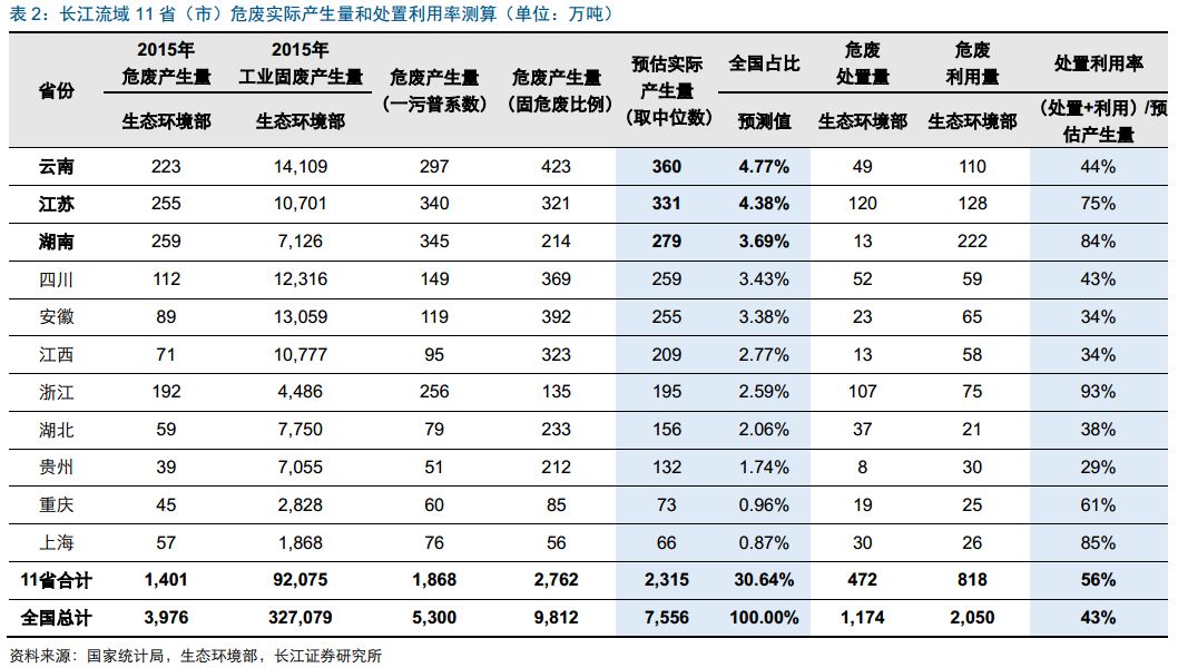 長江流域危廢量大,合規(guī)處置需求存在翻倍空間