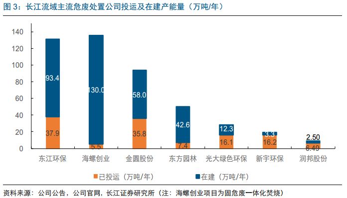 目前市場主流危廢企業(yè)包括東江環(huán)保/金圓股份/海螺創(chuàng)業(yè)/光大綠色環(huán)保/新宇環(huán)保/東方園林/潤邦股份,我們對這些企業(yè)在長江流域附近已投運(yùn)和籌/在建項(xiàng)目進(jìn)行梳理。