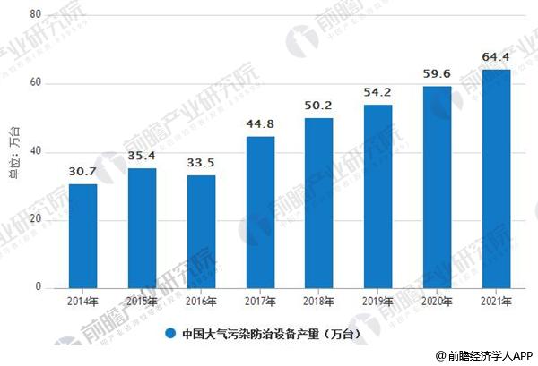 據(jù)前瞻產(chǎn)業(yè)研究院發(fā)布的《大氣污染治理行業(yè)市場前瞻與投資戰(zhàn)略規(guī)劃分析報告》數(shù)據(jù)顯示,2014年,中國大氣污染防治設備產(chǎn)量為30.7萬臺,同比增長11.89%;2015年,產(chǎn)量為35.4萬臺,同比增長5.9%;2016年1-9月,產(chǎn)量達到33.5萬臺,同比增長23.2%。到2017年中國大氣污染防治設備產(chǎn)量將達到44.8萬臺,未來五年(2017-2021)年均復合增長率約為9.50%,預計2018年,產(chǎn)量將達50.2萬臺,到了2021年中國大氣污染防治設備產(chǎn)量將達到64.4萬臺。