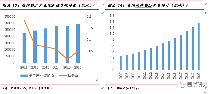 ②第二產(chǎn)業(yè)增加值測算法:由于危廢排放的企業(yè)多數(shù)來自于化工、有色等中游制造企業(yè),我們認(rèn)為危廢的實際產(chǎn)生量將與第二產(chǎn)業(yè)的景氣度是呈現(xiàn)正相關(guān)性。2007年至2016年,我國第二產(chǎn)業(yè)的增加值由11.58萬億元增長到29.65萬億元,復(fù)合增長率達9.91%,2007年污染源第一次普查時危廢實際產(chǎn)量為4573萬噸,在默認(rèn)普查數(shù)據(jù)為準(zhǔn)確數(shù)據(jù)的情況下,按照9.91%的危廢增長速率進行測算,2016年我國危廢實際產(chǎn)生量將達到1.07億噸。