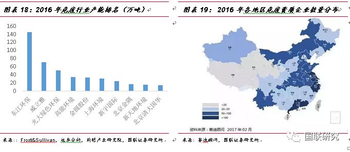 行業(yè)集中度低、規(guī)模小,公司處于絕對領(lǐng)先地位。我國的危廢行業(yè)的市場參與者眾多,但是具有規(guī)模效應(yīng)的企業(yè)很少,目前我國危廢行業(yè)呈現(xiàn)出的特征主要有以下幾點:①行業(yè)集中度低:根據(jù)Frost&Sullivan、遠(yuǎn)卓分析、前瞻產(chǎn)業(yè)研究院的統(tǒng)計數(shù)據(jù),截止 2016 年,行業(yè)內(nèi)排名前十大公司僅占總設(shè)計處置能力的6.8%,其中東江環(huán)保市占率為2.26%,處絕對領(lǐng)先地位;②危險廢物產(chǎn)生量與處理能力分布不匹配。2016年我國持危險廢棄物經(jīng)營許可證的企業(yè)數(shù)量為2149家,主要集中于長三角和珠三角區(qū)域,欠發(fā)達地區(qū)許可證數(shù)量少。其中江蘇、浙江和廣東三省資質(zhì)企業(yè)數(shù)量共計503家,占全國總數(shù)的30%以上。根據(jù)Frost&Sullivan的數(shù)據(jù),2015年危險廢物產(chǎn)生量主要集中在東部、西北部、中部,分別占總產(chǎn)生量的31%、24%,13%,可以看出華東地區(qū)及西北地區(qū)占危險廢物產(chǎn)生量的大部分。而經(jīng)濟發(fā)達地區(qū)如華東及華南占危險廢物處理能力的大部分。危廢處置行業(yè)中,東江環(huán)保、光大國際、威立雅中國、新宇國際等企業(yè)進入行業(yè)較早,經(jīng)過多年的發(fā)展已經(jīng)具備規(guī)模和產(chǎn)能優(yōu)勢,而且位于危廢產(chǎn)生量較大的省份,有較強的客戶資源和競爭優(yōu)勢。③經(jīng)營企業(yè)規(guī)模小、處理能力弱。按照2016年核準(zhǔn)經(jīng)營規(guī)模和企業(yè)數(shù)量的數(shù)據(jù)測算,平均每家的核準(zhǔn)處理能力僅為3萬噸/年,并且大部分企業(yè)技術(shù)、資金等實力較弱,日均處理能力超過50噸的企業(yè)占比不到20%,達到1000噸的僅占0.3%,并且能夠處理25種以上危廢種類的企業(yè)僅為1%,絕大多數(shù)均小于10種。在2017年,東江環(huán)保已具備44類危險廢物經(jīng)營資質(zhì),在危廢行業(yè)中處于絕對領(lǐng)先地位。