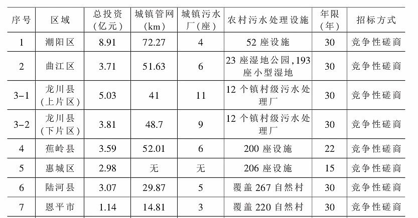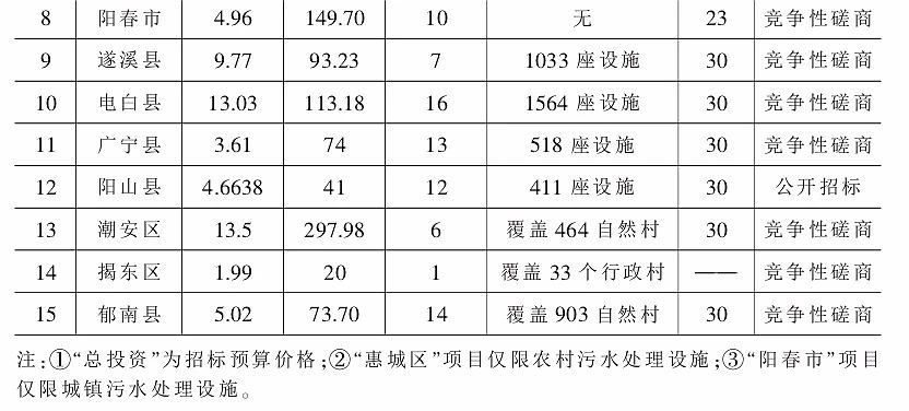 15個示范縣項(xiàng)目的統(tǒng)計(jì)數(shù)據(jù)顯示:(1)項(xiàng)目投資額在1-13.5億元之間;(2)項(xiàng)目PPP合作年限在15-30年之間;(3)大部分項(xiàng)目“城鎮(zhèn)與農(nóng)村”捆綁打包;(4)項(xiàng)目城鎮(zhèn)污水處理設(shè)施與配套管網(wǎng)共建。