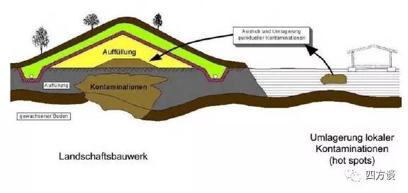 (2)隔離封閉,把污染物集中并用隔離膜封閉(Sicherungsmassnahmen)。當(dāng)污染物污染比較嚴(yán)重,分布范圍大、深,且對地下水也已經(jīng)造成污染,這種情況下,對污染源進(jìn)行清挖、換土費(fèi)用太高,一般選擇就地隔離封閉處理,阻止污染物進(jìn)一步向外擴(kuò)散。具體做法是:把場地的污染土壤集中在一起,堆成山丘,鋪上隔離層(一種很厚的塑料膜,使用壽命100余年),以免繼續(xù)污染地下水或者空氣。在隔離層之上鋪大約2米厚的可供植物生長的新土層,進(jìn)行景觀再造,改造成為休閑場所,如圖2所示。
