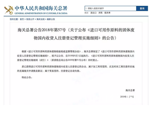 6月15日,海關(guān)總署發(fā)布今年第57號文件,根據(jù)《進口可用作原料的固體廢物檢驗檢疫監(jiān)督管理辦法》,海關(guān)總署制定了《進口可用作原料的固體廢物國內(nèi)收貨人注冊登記管理實施細則》,現(xiàn)予以公告,自2018年8月1日起執(zhí)行。《進口可用作原料的固體廢物國內(nèi)收貨人注冊登記管理實施細則(試行)》(原質(zhì)檢總局公告2009年第91號公布)同時廢止。