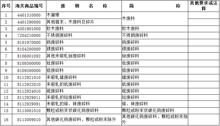 二、將不銹鋼廢碎料、鈦廢碎料、木廢碎料等16個(gè)品種固體廢物(見附件2),從《限制進(jìn)口類可用作原料的固體廢物目錄》《非限制進(jìn)口類可用作原料的固體廢物目錄》調(diào)入《禁止進(jìn)口固體廢物目錄》,自2019年12月31日起執(zhí)行。
