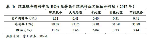 環(huán)衛(wèi)服務(wù)行業(yè)輕資產(chǎn)運(yùn)營(yíng),資產(chǎn)周轉(zhuǎn)率高。環(huán)衛(wèi)服務(wù)行業(yè)是典型的輕資產(chǎn)行業(yè),一般不涉及大型基建的建設(shè),從項(xiàng)目取得到實(shí)施運(yùn)營(yíng),一般不超過(guò)3個(gè)月,建設(shè)期的準(zhǔn)備工作主要是環(huán)衛(wèi)設(shè)備的采購(gòu)以及人員培訓(xùn)。根據(jù)Wind行業(yè)分類,從2017年財(cái)務(wù)數(shù)據(jù)來(lái)看,環(huán)衛(wèi)服務(wù)行業(yè)的資產(chǎn)周轉(zhuǎn)率遠(yuǎn)遠(yuǎn)高于環(huán)保行業(yè)其他領(lǐng)域,ROA水平也高于環(huán)保行業(yè)平均水平。