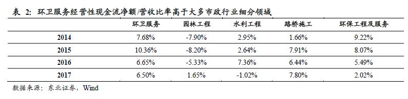 環(huán)衛(wèi)服務(wù)行業(yè)現(xiàn)金流穩(wěn)定。環(huán)衛(wèi)服務(wù)行業(yè)經(jīng)費(fèi)由地方財(cái)政預(yù)算撥付,一般來(lái)說(shuō)受需要保證環(huán)衛(wèi)工人的基本生活與市政服務(wù)的運(yùn)行等的影響,環(huán)衛(wèi)服務(wù)有專項(xiàng)資金保證,受政府財(cái)政情況影響較小,相對(duì)其他政府項(xiàng)目來(lái)說(shuō)現(xiàn)金流更為穩(wěn)定,拖欠概率大大降低。依據(jù)申萬(wàn)三級(jí)行業(yè)分類,環(huán)衛(wèi)服務(wù)經(jīng)營(yíng)性現(xiàn)金流狀況明顯好于市政行業(yè)其他細(xì)分領(lǐng)域(路橋施工除外)。