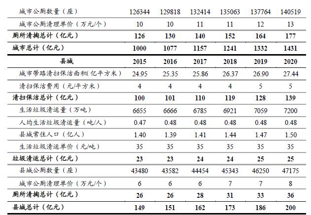 1.城鎮(zhèn)環(huán)衛(wèi)服務(wù)具體內(nèi)容主要包括道路清掃、垃圾轉(zhuǎn)運(yùn)、公廁清掏3項(xiàng),其余環(huán)衛(wèi)服務(wù)涉及內(nèi)容,如水域清潔、垃圾分類等,各地差異較大,且體量相對(duì)較小,因此暫不考慮。