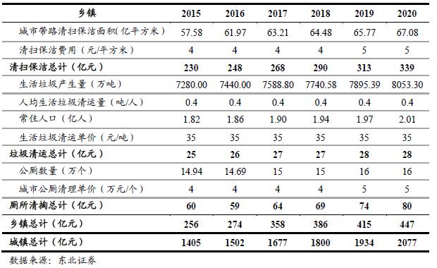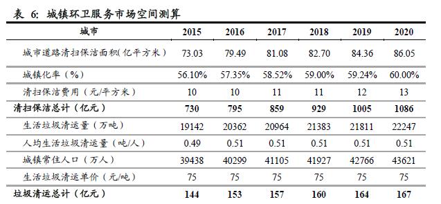 根據(jù)我們測(cè)算,城鎮(zhèn)環(huán)衛(wèi)服務(wù)市場(chǎng)空間年均近2000億元。核心假設(shè):