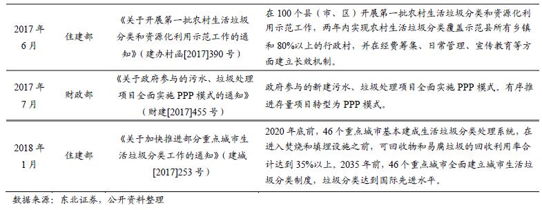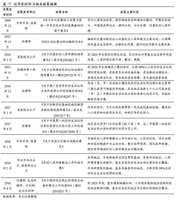 政府高度重視農(nóng)村人居環(huán)境問(wèn)題,農(nóng)村垃圾治理市場(chǎng)政策推動(dòng)強(qiáng)勁。2017-2018年中央一號(hào)文件接連強(qiáng)調(diào)農(nóng)村人居環(huán)境問(wèn)題。2017年中央“一號(hào)文件”明確提出,要推進(jìn)農(nóng)村生活垃圾治理專項(xiàng)行動(dòng),促進(jìn)垃圾分類和資源化利用。2018年中央“一號(hào)文件”進(jìn)一步指出,要實(shí)施農(nóng)村人居環(huán)境整治三年行動(dòng)計(jì)劃,以農(nóng)村垃圾、污水治理和村容村貌提升為主攻方向。2018年2月,國(guó)務(wù)院辦公廳發(fā)布《農(nóng)村人居環(huán)境整治三年行動(dòng)方案》,進(jìn)一步推動(dòng)解決農(nóng)村人居生態(tài)環(huán)境問(wèn)題,明確指出東部地區(qū)、中西部城市近郊區(qū)等有基礎(chǔ)、有條件的地區(qū),人居環(huán)境質(zhì)量全面提升,基本實(shí)現(xiàn)農(nóng)村生活垃圾處臵體系全覆蓋;中西部有較好基礎(chǔ)、基本具備條件的地區(qū),力爭(zhēng)實(shí)現(xiàn)90%左右的村莊生活垃圾得到治理。