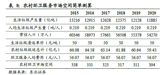 3.根據(jù)安徽省宣城市誓節(jié)鎮(zhèn)20個(gè)行政村環(huán)衛(wèi)市場(chǎng)化項(xiàng)目,農(nóng)村環(huán)衛(wèi)項(xiàng)目人均費(fèi)用56.07元/年,據(jù)此推斷農(nóng)村環(huán)衛(wèi)項(xiàng)目年均金額約為300億元。
