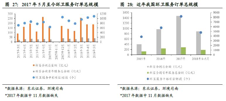 從各省市釋放的訂單情況來(lái)看,2018年至今,環(huán)衛(wèi)服務(wù)項(xiàng)目在項(xiàng)目數(shù)量和平均規(guī)模上都實(shí)現(xiàn)了大幅增長(zhǎng)。2018年1~4月,環(huán)衛(wèi)服務(wù)中標(biāo)項(xiàng)目(標(biāo)段)共3694個(gè),較2017年同期同比增長(zhǎng)46.82%;新簽合同總金額703.45億元,同比增長(zhǎng)125.40%;新簽合同首年服務(wù)總金額為148.31億元,同比增長(zhǎng)86.39%;平均每項(xiàng)目(標(biāo)段)0.19億元,同比增長(zhǎng)53.52%。環(huán)衛(wèi)服務(wù)項(xiàng)目訂單數(shù)量放出呈現(xiàn)爆發(fā)式增長(zhǎng),利好已進(jìn)入行業(yè)、有示范項(xiàng)目的龍頭企業(yè),對(duì)于有良好政府資源、試圖進(jìn)入環(huán)衛(wèi)服務(wù)行業(yè)的企業(yè)也將成為一個(gè)機(jī)會(huì)。