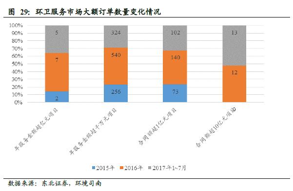 環(huán)衛(wèi)服務(wù)市場(chǎng)大額訂單數(shù)量明顯增多。從大額訂單的數(shù)目上來(lái)看,總金額超過(guò)10億元的項(xiàng)目,2016年12個(gè),2017年1-7月就13個(gè),總金額超過(guò)1億元的項(xiàng)目,2016年是140個(gè),2017年1-7月就102個(gè)。從政府角度來(lái)講,大額訂單數(shù)量的增多,與環(huán)衛(wèi)一體化的發(fā)展趨勢(shì)關(guān)系密切,政府越來(lái)越多傾向于綜合解決市容環(huán)境衛(wèi)生問(wèn)題。從市場(chǎng)發(fā)展角度來(lái)講,大額訂單數(shù)量明顯增加,對(duì)從事環(huán)衛(wèi)服務(wù)項(xiàng)目的企業(yè)資金、管理要求更高,利好具有長(zhǎng)期環(huán)衛(wèi)項(xiàng)目運(yùn)營(yíng)管理經(jīng)驗(yàn)的龍頭企業(yè),預(yù)計(jì)行業(yè)將進(jìn)一步整合發(fā)展。