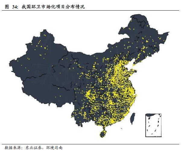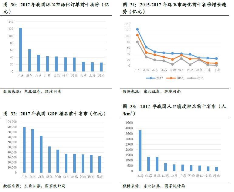 人口大省和經(jīng)濟(jì)大省環(huán)衛(wèi)市場(chǎng)化推進(jìn)更快,經(jīng)濟(jì)欠發(fā)達(dá)地區(qū)和人口規(guī)模較少省份環(huán)衛(wèi)市場(chǎng)化推進(jìn)速度略慢。以河北、河南、安徽為例,河北省2017年GDP總量36000億元,排名第8,同時(shí)人口密度排名第10,達(dá)397.34人/km2,其環(huán)衛(wèi)市場(chǎng)化份額從2015年的7億,到2016年的24億,再到2017年的39億,;河南省2017年GDP總量44988.1億元,排名第6,同時(shí)人口密度排名第7,達(dá)570.8人/km2,其環(huán)衛(wèi)市場(chǎng)化份額從2015年的4億,到2016年的9億,再到2017年的25億;安徽省2017年GDP總量27518.7億元,排名第14,同時(shí)人口密度排名第9,達(dá)443.8人/km2,其環(huán)衛(wèi)市場(chǎng)化份額從2015年的7億,到2016年的23億,再到2017年的42億。根據(jù)環(huán)衛(wèi)司南發(fā)布的環(huán)衛(wèi)市場(chǎng)化進(jìn)程圖,目前環(huán)衛(wèi)服務(wù)項(xiàng)目主要集中在華北、華東、華南等經(jīng)濟(jì)發(fā)達(dá)地區(qū)或人口密集地區(qū),其余地區(qū)環(huán)衛(wèi)市場(chǎng)化推進(jìn)速度緩慢。