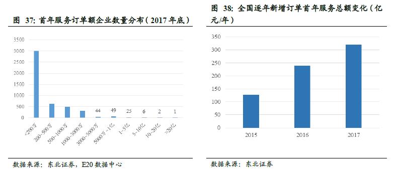 環(huán)衛(wèi)服務(wù)企業(yè)數(shù)量眾多,規(guī)模企業(yè)數(shù)量少。根據(jù)E20數(shù)據(jù)中心,截止2017年底,環(huán)衛(wèi)服務(wù)企業(yè)總計(jì)5000多家,其中首年服務(wù)金額低于200萬(wàn)元的約有3000家,占比60%左右;首年服務(wù)金額在3000萬(wàn)以上的企業(yè)僅有127家。由于目前環(huán)衛(wèi)服務(wù)市場(chǎng)的發(fā)展對(duì)于企業(yè)資金和管理經(jīng)驗(yàn)的要求都更加嚴(yán)格,小規(guī)模環(huán)衛(wèi)企業(yè)競(jìng)爭(zhēng)力低,預(yù)計(jì)未來(lái)3~5年內(nèi)行業(yè)將加速整合。
