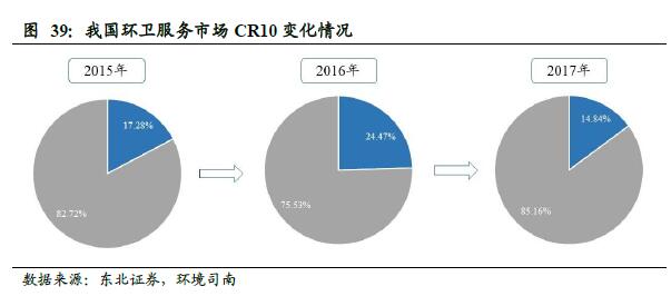 作業(yè)方式一體化,是指區(qū)域內(nèi)的環(huán)衛(wèi)服務(wù)作業(yè),包括從分類、清掃、保潔、運(yùn)輸、中轉(zhuǎn)、最終處理等的全過(guò)程,都由一家主體進(jìn)行。一方面,一家主體對(duì)區(qū)域內(nèi)進(jìn)行作業(yè),可以明確責(zé)任主體,防治作業(yè)界面推諉扯皮,減少不必要的摩擦成本,提升整體作業(yè)質(zhì)量;另一方面,通過(guò)對(duì)環(huán)衛(wèi)產(chǎn)業(yè)鏈的協(xié)同整合,可以有效形成規(guī)模效應(yīng),降低作業(yè)整合處理成本。作業(yè)方式一體化,正符合當(dāng)前環(huán)衛(wèi)服務(wù)企業(yè)向產(chǎn)業(yè)鏈上下游延伸的發(fā)展趨勢(shì)。垃圾分類一體化的趨勢(shì),與當(dāng)前我國(guó)垃圾分類工作的推進(jìn)密切相關(guān)。2017年3月,《生活垃圾分類制度實(shí)施方案》正式發(fā)布,其中對(duì)垃圾分類工作提出了具體的要求和目標(biāo)。將垃圾分類與環(huán)衛(wèi)服務(wù)結(jié)合進(jìn)行,一方面,打通了環(huán)衛(wèi)服務(wù)上下游的產(chǎn)業(yè)鏈,有助于居民環(huán)保意識(shí)的進(jìn)一步提高,利于產(chǎn)業(yè)鏈的良性發(fā)展;另一方面,對(duì)垃圾從源頭開(kāi)始分類,利于建立與分類品種相配套的收運(yùn)體系,建立與再生資源利用相協(xié)調(diào)的回收體系,完善與垃圾分類相銜接的終端處理設(shè)施,有助于循環(huán)經(jīng)濟(jì)鏈條的進(jìn)一步完善。城鄉(xiāng)環(huán)衛(wèi)一體化是指將城市與農(nóng)村的環(huán)衛(wèi)工作放在同等重要的位臵,通過(guò)統(tǒng)一規(guī)劃,統(tǒng)一安排,科學(xué)有序地開(kāi)展環(huán)衛(wèi)服務(wù),徹底解決農(nóng)村“垃圾圍村”、環(huán)境臟亂差的問(wèn)題。城鄉(xiāng)環(huán)衛(wèi)一體化的趨勢(shì)使得環(huán)衛(wèi)服務(wù)項(xiàng)目單個(gè)體量更大,對(duì)環(huán)衛(wèi)服務(wù)公司的運(yùn)營(yíng)、管理經(jīng)驗(yàn)要求更高。