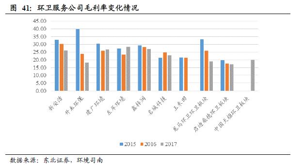 環(huán)衛(wèi)服務(wù)企業(yè)毛利率2015~2017年整體呈現(xiàn)下滑趨勢(shì)。一方面,環(huán)衛(wèi)服務(wù)市場(chǎng)入行門檻不高,入行企業(yè)增多,行業(yè)競(jìng)爭(zhēng)日益激烈;另一方面,由于市場(chǎng)規(guī)模迅速擴(kuò)張,環(huán)衛(wèi)服務(wù)企業(yè)在手大量新拿訂單還在磨合期,磨合成本較高,對(duì)毛利率水平產(chǎn)生了影響。