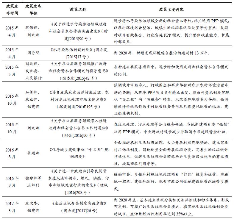 之后十年,環(huán)衛(wèi)服務(wù)市場(chǎng)進(jìn)入小規(guī)模市場(chǎng)化試點(diǎn)階段,環(huán)衛(wèi)市場(chǎng)化運(yùn)作企業(yè)以中小規(guī)模為主。我國(guó)部分沿海發(fā)達(dá)城市率先啟動(dòng)政府采購(gòu)公共服務(wù)試點(diǎn),開(kāi)始對(duì)環(huán)衛(wèi)項(xiàng)目進(jìn)行招標(biāo)。2002年建設(shè)部印發(fā)《關(guān)于加快市政公用行業(yè)市場(chǎng)化進(jìn)程的意見(jiàn)》,開(kāi)放市政公用行業(yè)市場(chǎng),將政府管理方式從直接管理轉(zhuǎn)變?yōu)楹暧^管理。2006年《關(guān)于印發(fā)中國(guó)城鄉(xiāng)環(huán)境衛(wèi)生體系建設(shè)的通知》和《中國(guó)城鄉(xiāng)環(huán)境體系建設(shè)》白皮書等文件的出臺(tái),明確提出要加快環(huán)境衛(wèi)生市場(chǎng)化運(yùn)作步伐。2013年以來(lái),環(huán)衛(wèi)服務(wù)進(jìn)入市場(chǎng)化推廣階段,企業(yè)規(guī)模逐漸擴(kuò)大,政府加大公共服務(wù)力度,政府職能發(fā)生轉(zhuǎn)變,市政服務(wù)項(xiàng)目更多交由第三方運(yùn)作。十八屆三中全會(huì)提出“允許社會(huì)資本通過(guò)特許經(jīng)營(yíng)等方式參與城市基礎(chǔ)設(shè)施投資和運(yùn)營(yíng)”,公共服務(wù)項(xiàng)目的市場(chǎng)化趨勢(shì)越發(fā)明朗。2013年國(guó)務(wù)院辦公廳發(fā)布《關(guān)于政府向社會(huì)力量購(gòu)買服務(wù)的指導(dǎo)意見(jiàn)》,明確要求在公共服務(wù)領(lǐng)域更多利用社會(huì)力量,加大政府購(gòu)買服務(wù)力度。2015年下發(fā)《關(guān)于在公共服務(wù)領(lǐng)域推廣政府和社會(huì)資本合作模式指導(dǎo)意見(jiàn)》,鼓勵(lì)私營(yíng)企業(yè)、民營(yíng)資本與政府進(jìn)行合作,參與公共基礎(chǔ)設(shè)施的建設(shè)。2017年7月,財(cái)政部等四部門聯(lián)合出臺(tái)文件,明確提出污水、垃圾處理領(lǐng)域全面采用PPP模式,PPP模式由垃圾處理領(lǐng)域向上游環(huán)衛(wèi)領(lǐng)域延伸。