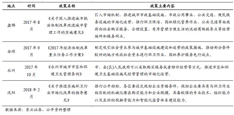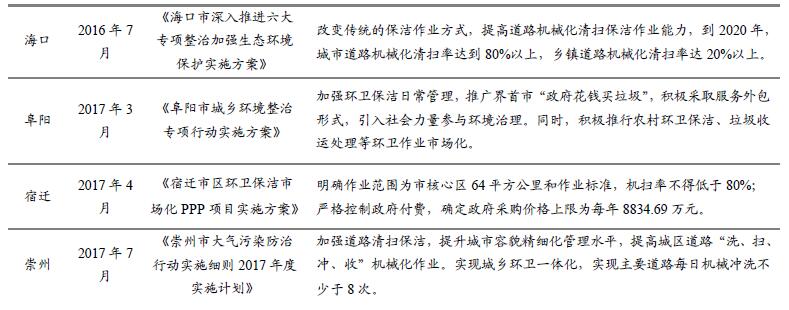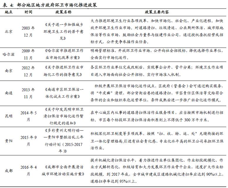 地方政府進(jìn)一步將環(huán)衛(wèi)市場(chǎng)化改革落到實(shí)處,加速政企分離、開(kāi)放政府購(gòu)買社會(huì)服務(wù),政府負(fù)責(zé)環(huán)衛(wèi)工作的監(jiān)督管理及項(xiàng)目的公開(kāi)招標(biāo),企業(yè)負(fù)責(zé)作業(yè)的具體實(shí)施。