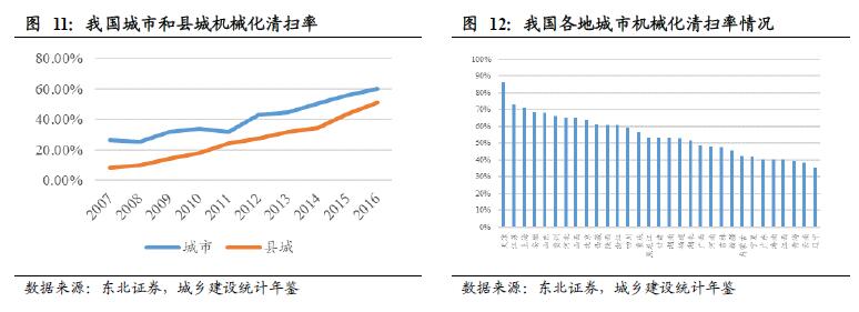 (2)充分利用社會(huì)資本的資金優(yōu)勢(shì),根據(jù)需求采購(gòu)必要的環(huán)衛(wèi)設(shè)備,提高環(huán)衛(wèi)作業(yè)的機(jī)械化率,改善效率,降低成本。與此同時(shí),機(jī)械化的發(fā)展可一定程度上改善環(huán)衛(wèi)職工的年齡結(jié)構(gòu),一定程度上提高環(huán)衛(wèi)工人的工資和待遇水平,促進(jìn)社會(huì)和諧發(fā)展。目前我國(guó)機(jī)械化清掃率比例僅為50.60%,與歐美80%的全面機(jī)械化清掃率比例相比還具有較高的提升空間。十二五期間我國(guó)城市道路機(jī)械化清掃率從2012年的40.43%提高到2016年的50.60%,預(yù)計(jì)隨著環(huán)衛(wèi)市場(chǎng)化進(jìn)程加速這一趨勢(shì)將進(jìn)一步提高。