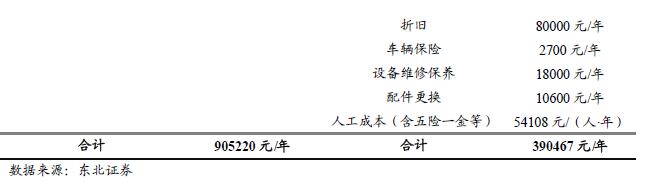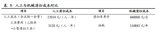 經(jīng)核算,機(jī)械清掃成本遠(yuǎn)低于人工清掃成本。機(jī)械清掃和人工清掃的成本核算的核心假設(shè)如下:①據(jù)調(diào)研統(tǒng)計(jì),一輛普通洗掃車的工作效率相當(dāng)于30個(gè)環(huán)衛(wèi)工人;②環(huán)衛(wèi)工人的薪資為1500元/月,五險(xiǎn)一金由環(huán)衛(wèi)服務(wù)公司額外繳納;③洗掃車的折舊年限為8年;④一輛普通洗掃車配3名員工,薪資為3000元/月,五險(xiǎn)一金由環(huán)衛(wèi)服務(wù)公司額外繳納。