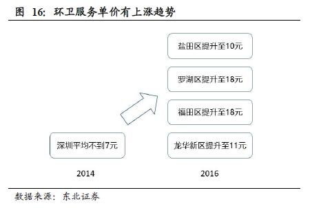 環(huán)衛(wèi)服務(wù)價(jià)格呈現(xiàn)明顯的上漲趨勢(shì)。一方面,人力成本在不斷上漲,部分環(huán)衛(wèi)服務(wù)項(xiàng)目合同中的附加條款有所說(shuō)明,如果人力成本有所浮動(dòng),相應(yīng)的合同單價(jià)也會(huì)進(jìn)行調(diào)整。另一方面,環(huán)衛(wèi)服務(wù)單價(jià)與作業(yè)質(zhì)量等級(jí)和監(jiān)管要求關(guān)系較為密切。服務(wù)質(zhì)量的提升需要環(huán)衛(wèi)企業(yè)投入更多的人力、物理和管理,作業(yè)質(zhì)量等級(jí)越高,購(gòu)買服務(wù)的價(jià)格也越高,這兩者之間存在顯著的正相關(guān)關(guān)系。