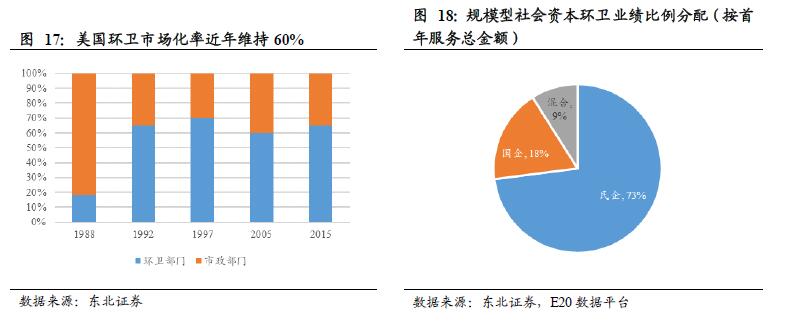 我國(guó)環(huán)衛(wèi)服務(wù)市場(chǎng)滲透率不足三成。長(zhǎng)時(shí)間以來(lái),我國(guó)的環(huán)衛(wèi)服務(wù)工作由政府有關(guān)部門管轄,包括市容管理局、住房和城鎮(zhèn)建設(shè)環(huán)衛(wèi)業(yè)務(wù),環(huán)境衛(wèi)生管理局等部門。據(jù)不完全統(tǒng)計(jì),目前環(huán)衛(wèi)服務(wù)市場(chǎng)滲透率不足30%,加上縣城和鄉(xiāng)鎮(zhèn)環(huán)衛(wèi)市場(chǎng)的開(kāi)拓,環(huán)衛(wèi)服務(wù)市場(chǎng)還有很高的上升空間。美國(guó)環(huán)衛(wèi)市場(chǎng)化率約為65%,得益于政策推動(dòng)和垃圾處理成本上漲。由于美國(guó)地廣人稀,垃圾填埋有較高成本優(yōu)勢(shì),垃圾填埋是其主要處理方式。1991年美國(guó)環(huán)保署出臺(tái)了多項(xiàng)環(huán)保政策,大幅提升了固廢處理和環(huán)衛(wèi)運(yùn)營(yíng)標(biāo)準(zhǔn),1985-1995年期間美國(guó)垃圾填埋場(chǎng)傾倒費(fèi)漲幅達(dá)170%,給財(cái)政支出帶來(lái)了很大的壓力,政府為了減輕財(cái)政負(fù)擔(dān),將環(huán)衛(wèi)服務(wù)交給效率更高的第三方專業(yè)機(jī)構(gòu)完成,環(huán)衛(wèi)服務(wù)公開(kāi)招標(biāo)逐漸常態(tài)化。美國(guó)環(huán)衛(wèi)市場(chǎng)化程度也從1988年的15%迅速提升至1992年的65%,并維持至今。