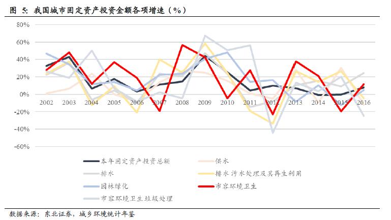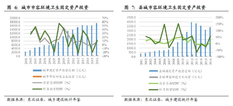 城市環(huán)衛(wèi)基礎(chǔ)設(shè)施建設(shè)具有明顯的公用事業(yè)的屬性,環(huán)衛(wèi)基礎(chǔ)設(shè)施建設(shè)隨著城市的擴(kuò)張和城鎮(zhèn)化的進(jìn)程而不斷進(jìn)行。我國(guó)城市環(huán)衛(wèi)固定資產(chǎn)投資占比穩(wěn)定,維持在2~3%之間。根據(jù)國(guó)家統(tǒng)計(jì)局的統(tǒng)計(jì)口徑,環(huán)衛(wèi)固定資產(chǎn)范圍包括政府有關(guān)部門直接購(gòu)買的環(huán)衛(wèi)車輛、建設(shè)的垃圾中轉(zhuǎn)站等,環(huán)衛(wèi)服務(wù)市場(chǎng)化之后第三方服務(wù)機(jī)構(gòu)建設(shè)購(gòu)買的固定資產(chǎn)不包含在內(nèi)。與其他市政固定資產(chǎn)投資相比,城市環(huán)衛(wèi)固定資產(chǎn)投資增幅波動(dòng)幅度較大,基本圍繞固定資產(chǎn)投資總額增幅變化,2013~2014年增速明顯高于固定資產(chǎn)總額,2015年增速明顯低于固定資產(chǎn)總額,2016年基本持平,基本沒(méi)有出現(xiàn)連續(xù)一段時(shí)間持續(xù)高于固定資產(chǎn)總額增速的情況。從占比情況來(lái)看,我國(guó)城市環(huán)衛(wèi)固定資產(chǎn)投資金額占比長(zhǎng)期穩(wěn)定在2%~3%之間,相對(duì)較穩(wěn)定。分別從城市和縣城環(huán)衛(wèi)固定資產(chǎn)投資額變化情況上來(lái)看,縣城環(huán)衛(wèi)固定資產(chǎn)投資增速2016年明顯高于固定資產(chǎn)總額增速,說(shuō)明隨著經(jīng)濟(jì)的發(fā)展,越來(lái)越多地方政府財(cái)政狀況的充盈,縣城也開(kāi)始愈加重視市容環(huán)境問(wèn)題,對(duì)于之后縣城環(huán)衛(wèi)服務(wù)市場(chǎng)的開(kāi)拓也是十分有利的。