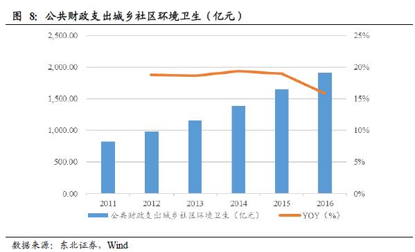 環(huán)衛(wèi)相關(guān)的公共財(cái)政支出每年增幅穩(wěn)定在15%~20%。由于環(huán)衛(wèi)的公用事業(yè)屬性,環(huán)衛(wèi)的支出一般來(lái)自于公共財(cái)政支出。根據(jù)統(tǒng)計(jì)口徑,公共財(cái)政支出環(huán)衛(wèi)項(xiàng)目中,既包括環(huán)衛(wèi)工程投入也包括運(yùn)營(yíng)投入,既包括政府自行主導(dǎo)環(huán)衛(wèi)項(xiàng)目也包括外包第三方服務(wù)機(jī)構(gòu)的環(huán)衛(wèi)服務(wù)項(xiàng)目,指標(biāo)用于反映環(huán)衛(wèi)服務(wù)市場(chǎng)空間更為全面。政府直接主導(dǎo)的環(huán)衛(wèi)服務(wù)資金主要來(lái)自于政府性基金支出,環(huán)衛(wèi)一體化PPP項(xiàng)目中資金主要來(lái)自于一般公共財(cái)政支出。2012~2016年,我國(guó)環(huán)衛(wèi)公共財(cái)政支出年均增長(zhǎng)率接近20%,2016年環(huán)衛(wèi)公共財(cái)政支出1915.03億元,體量巨大。