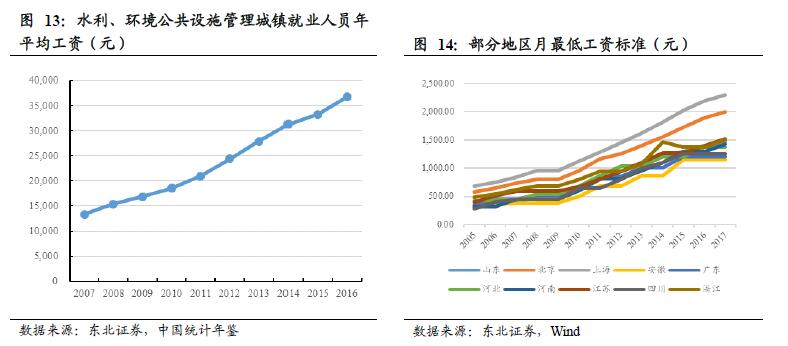 機(jī)械清掃在提高效率的同時(shí)可顯著降低成本。由于環(huán)衛(wèi)工作具有較低的技術(shù)含量,因此環(huán)衛(wèi)工人的工資水平普遍與各地最低工資標(biāo)準(zhǔn)接近。環(huán)衛(wèi)服務(wù)的成本中大約60%-80%左右為人工成本,對(duì)環(huán)衛(wèi)服務(wù)總成本影響較大。隨著居民生活水平的提高,我國(guó)各個(gè)地區(qū)的最低工資標(biāo)準(zhǔn)也隨之提高,人工支出對(duì)環(huán)衛(wèi)服務(wù)帶來(lái)的成本壓力愈加明顯。