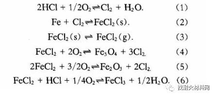 垃圾中塑料、橡膠和廚房廢料中都含有氯元素,例如聚氯乙烯廢物、聚偏二氯乙烯廢物、氯化丁基橡膠廢物、氯化鈉、氯化鉀等,這些有機(jī)和無(wú)機(jī)氯化物在高溫焚燒后都會(huì)產(chǎn)生HCl。垃圾焚燒廢氣中的氧的質(zhì)量分?jǐn)?shù)為5%?10%,而HCl的質(zhì)量濃度為800?4000mg/m3。高溫HCl的腐蝕機(jī)理目前報(bào)道較多的是活化氧化的機(jī)理,可見(jiàn)以下化學(xué)反應(yīng)式: