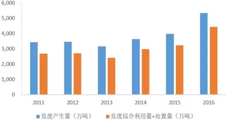 近年來(lái)危廢產(chǎn)量逐年上升,雖然危廢處置規(guī)模也在擴(kuò)大,但供需缺口要遠(yuǎn)比數(shù)據(jù)顯示的嚴(yán)峻。根據(jù)國(guó)家統(tǒng)計(jì)局?jǐn)?shù)據(jù),2016年我國(guó)共產(chǎn)生危險(xiǎn)廢物5347萬(wàn)噸,較上年同期增長(zhǎng)34.49%;但2016年危廢處置缺口達(dá)到917萬(wàn)噸,由于危廢產(chǎn)生量是通過(guò)企業(yè)申報(bào)數(shù)據(jù)統(tǒng)計(jì)的,往往較實(shí)際情況要低的多。此外,由于危廢處置實(shí)際產(chǎn)能也要低于經(jīng)營(yíng)許可證產(chǎn)能,危廢處置實(shí)際缺口要遠(yuǎn)高于統(tǒng)計(jì)水準(zhǔn)。