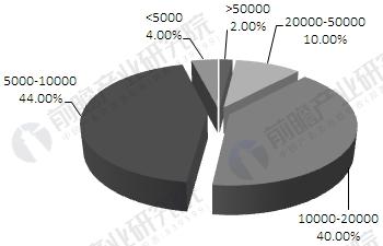 報廢汽車回收拆解企業(yè)按汽車回收量規(guī)模分布圖(單位:輛,%)
